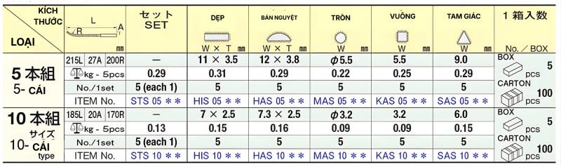| Bộ dũa khuôn PRO cong hỗn hợp 5 cây bán tinh STS1002 | STS1002 | Bán tinh | 185Lx20Ax170R |